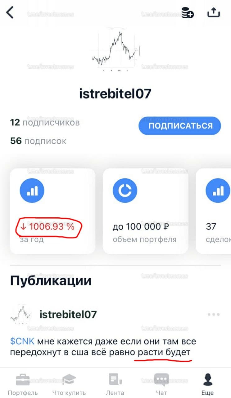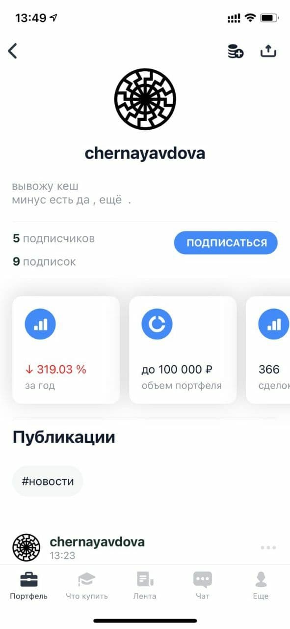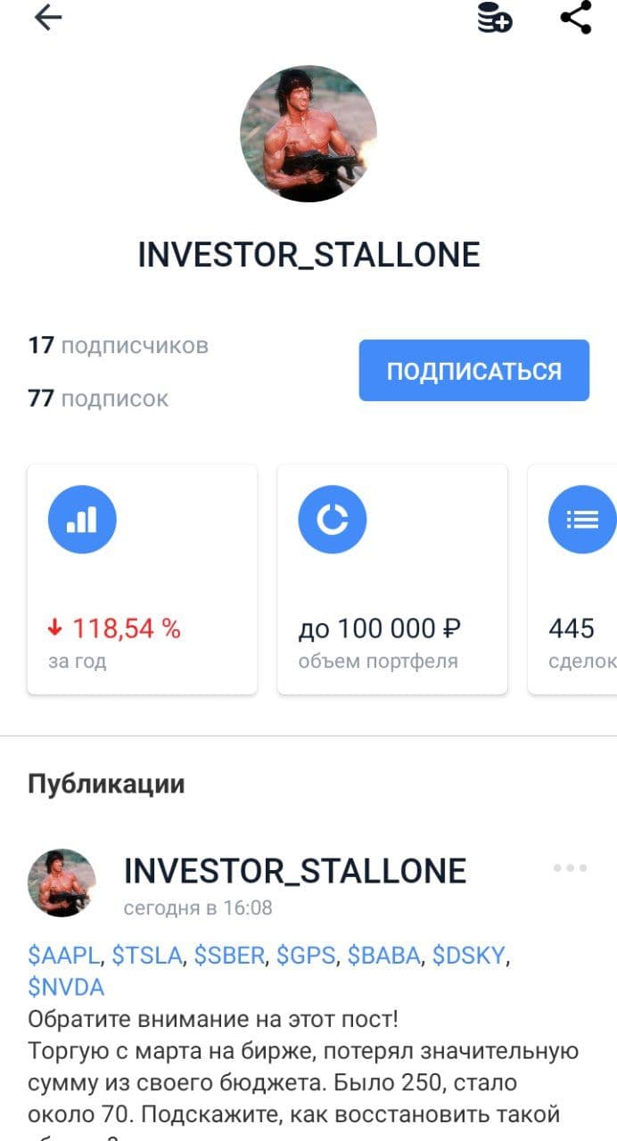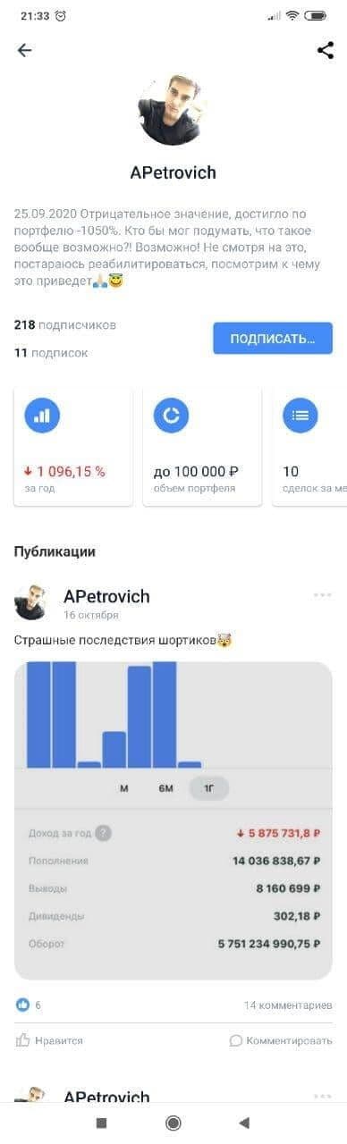Думаю, что в случае тематики этой главы мне стоит сделать то же самое. В брокерском приложении Тинькофф Инвестиции существует функционал социальной сети под названием «Пульс», там участники могут писать свои посты по поводу тех или иных акций, при этом их портфель становится доступным для просмотра другим участникам сети. Можно увидеть примерную сумму на счету человека, доходность за последний год, а также историю сделок. Это стало кладезем примеров безумного и сверхрискованного инвестирования с предсказуемо печальным финалом. Ниже я покажу несколько примеров.