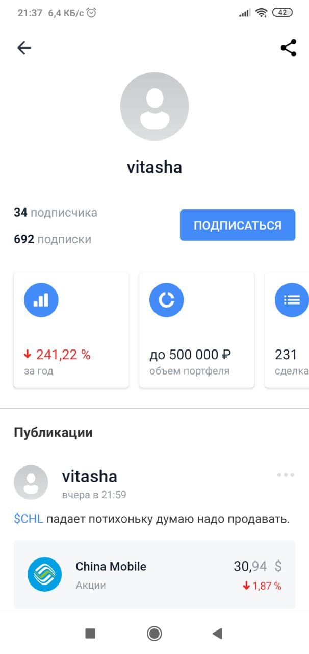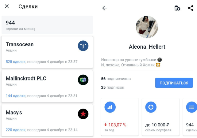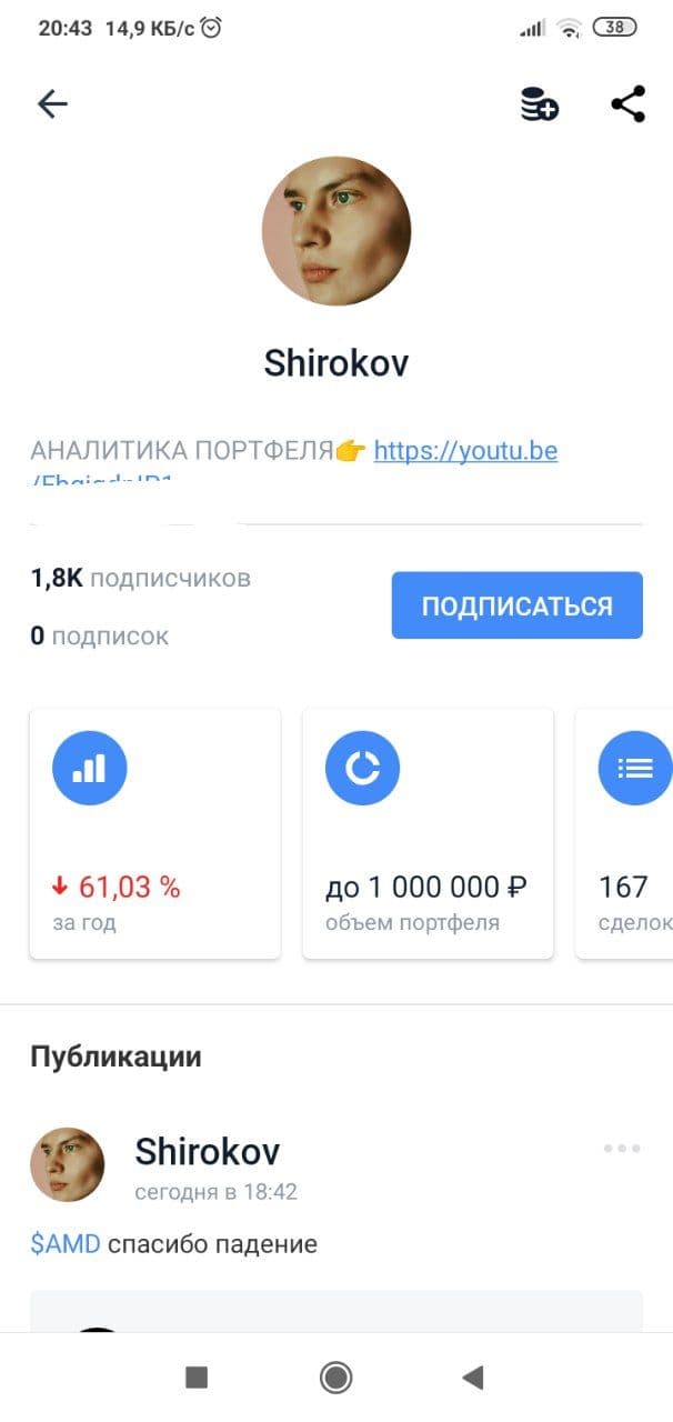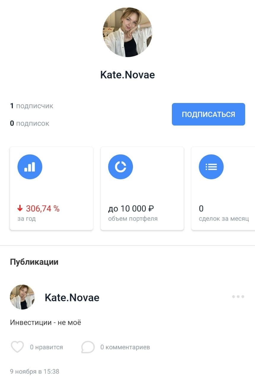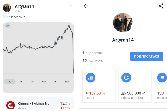 Думаю, что в случае тематики этой главы мне стоит сделать то же самое. В брокерском приложении Тинькофф Инвестиции существует функционал социальной сети под названием «Пульс», там участники могут писать свои посты по поводу тех или иных акций, при этом их портфель становится доступным для просмотра другим участникам сети. Можно увидеть примерную сумму на счету человека, доходность за последний год, а также историю сделок. Это стало кладезем примеров безумного и сверхрискованного инвестирования с предсказуемо печальным финалом. Ниже я покажу несколько примеров.